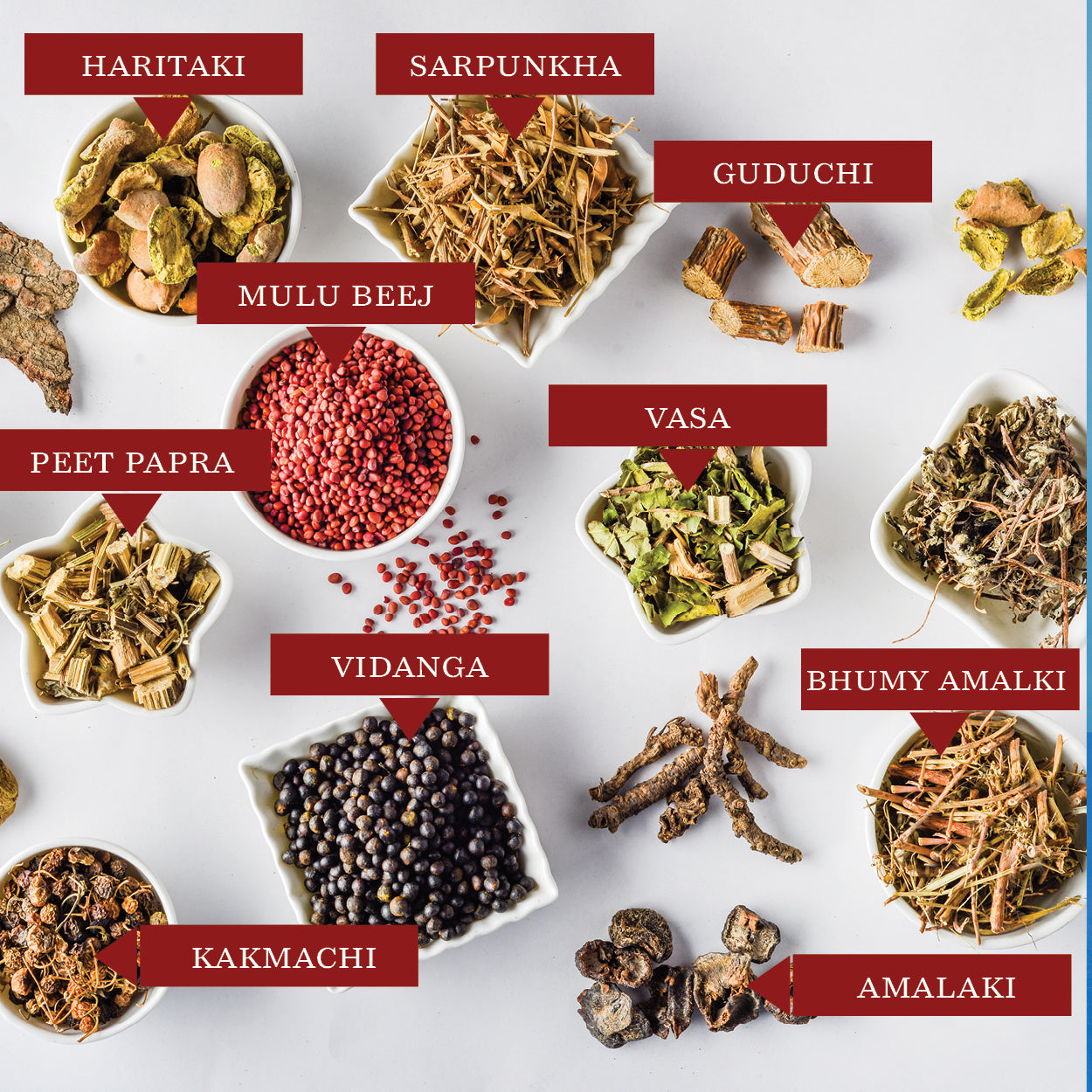 Triphala, Guduchi, Kutaki, Kalmegha, Vasa, Amalaki, Bibhitaki, Haritaki, Nimba, Kakmachi, Bhumyamlaki, Bhringraj, Peetpapra, Vidanga, Sarpunkha, and Muli