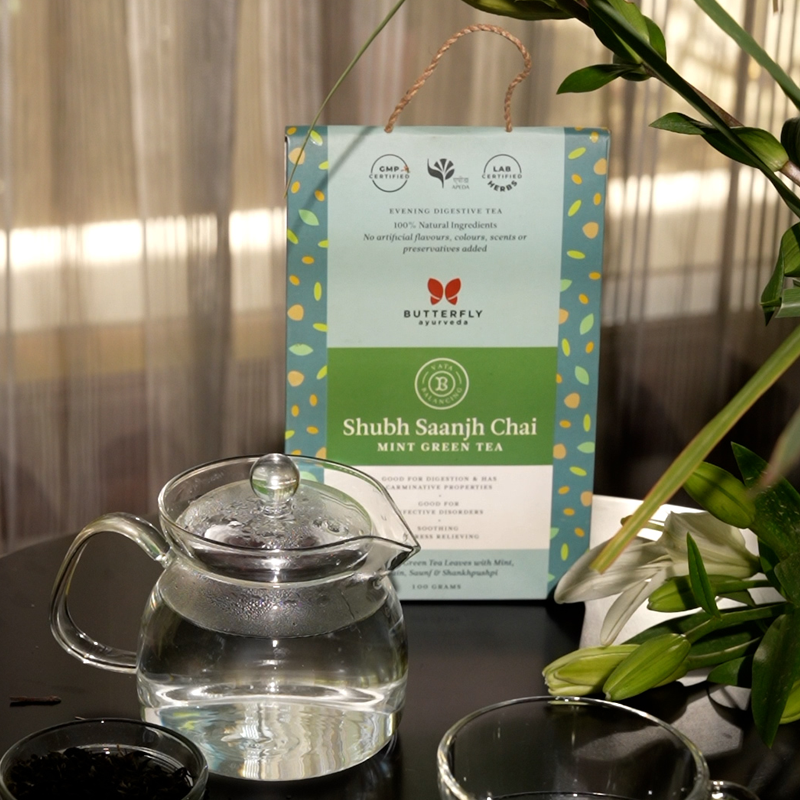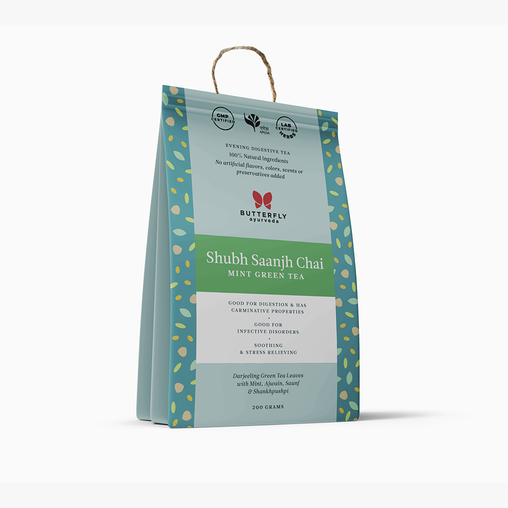 Our calming and rejuvenating Shubh Saanjh Chai (Good Evening Mint Green Tea) is a digestive tea specifically designed for the evenings. The blend includes Mint, Ajwain, Fennel, Shankhpushpi blended with Darjeeling green tea leaves. This Mint green tea is specially made for the evenings to pacify the Vata Dosha.