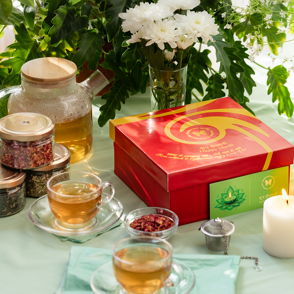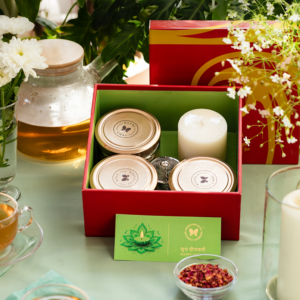 This gift features a selection of three herbal tea blends, that include Ratri Chai, Masala Chai, and Rose petal infusion, elegantly packaged in glass jars accompanied by an infuser, a scented candle and a heartfelt greeting card.