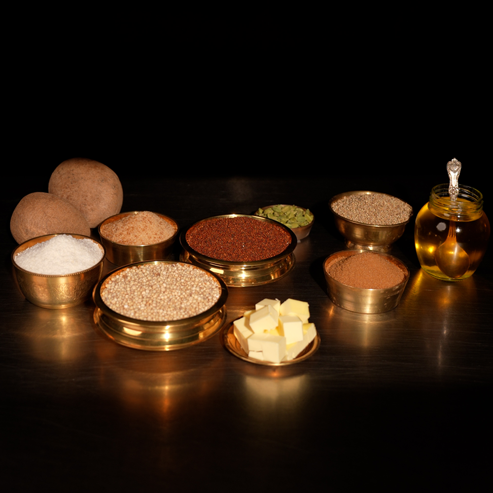 Non-Vegan: Bajra Flour, Ragi Flour, Jwar flour, Khand, Elaichi Powder, Cow Ghee, Baking Powder, Baking Soda, Dry Nariyal Powder