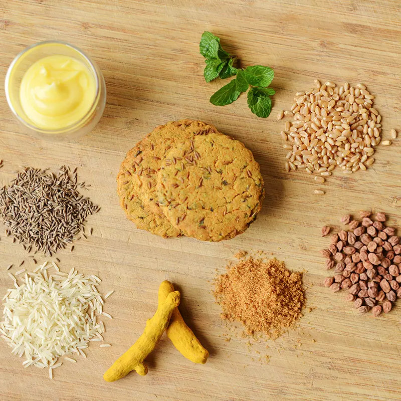 A refreshing snack with just the right amount of crunch. The taste of roasted black gram flour is prominent, topped with jeera, leaving an after-taste of mint. This Vata balancing digestive multigrain cookie is the perfect accompaniment to your evening tea.