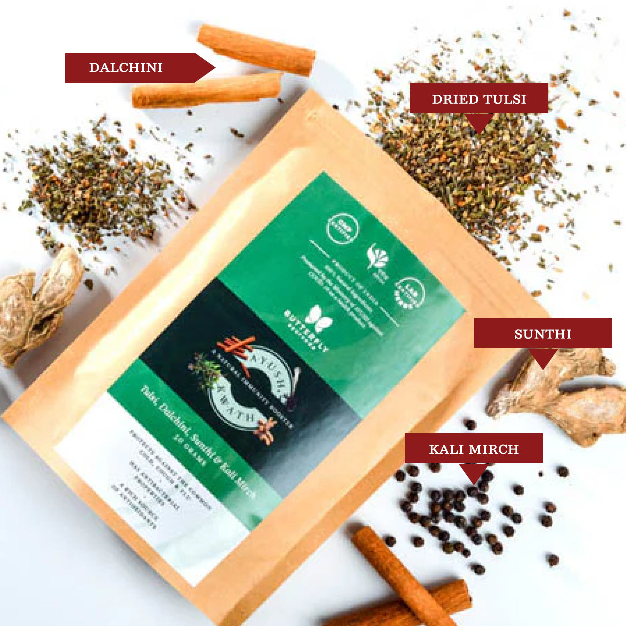 Tulsi (Ocimum sanctum), Dalchini (Cinnamomum zeylanicum), Sunthi (Zingiber officinale) and Kali Mirch (Piper nigrum).