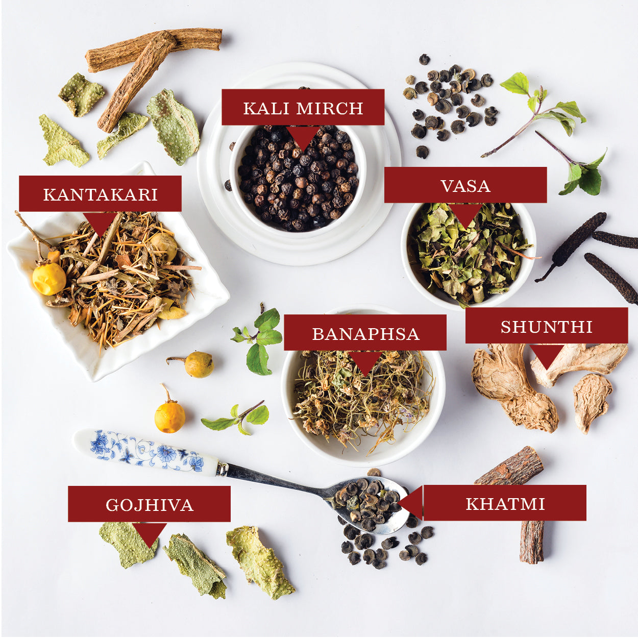 Vasa, Tulsi, Gojhiva, Khatmi, Mulethi, Kantakari, Kali Mirch, Pippali, Shunthi, Pushkara & Banaphsa
