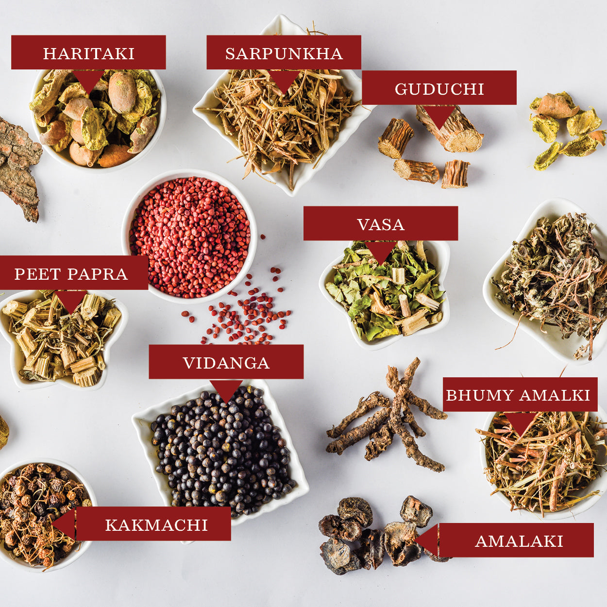 Triphala, Guduchi, Kutaki, Kalmegha, Vasa, Amalaki, Bibhitaki, Haritaki, Nimba, Kakmachi, Bhumyamlaki, Bhringraj, Peetpapra, Vidanga, Sarpunkha, and Muli