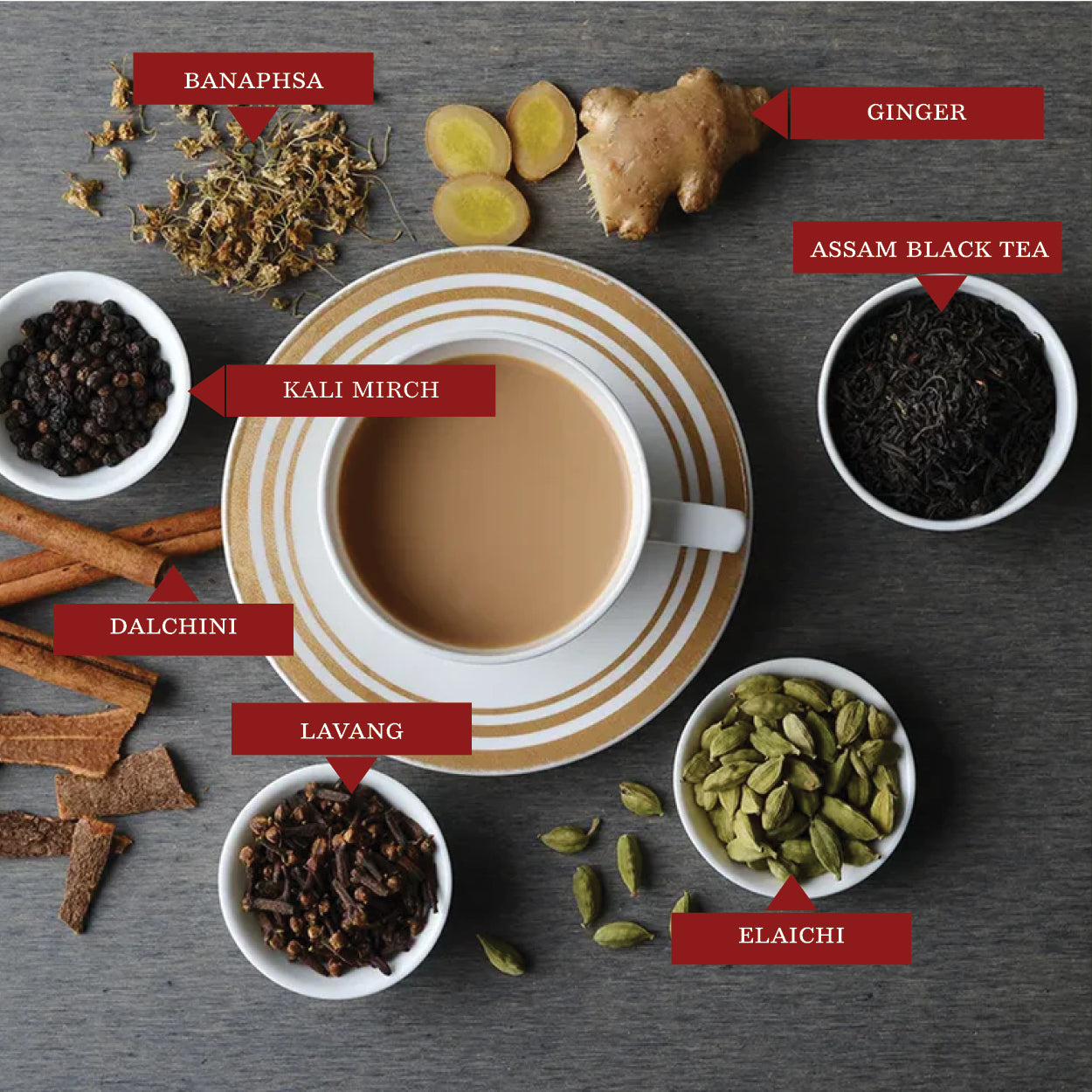 Assam Black Tea Leaves, Banaphsa, Lavang, Dalchini, Ginger, Kali Mirch, Elaichi
