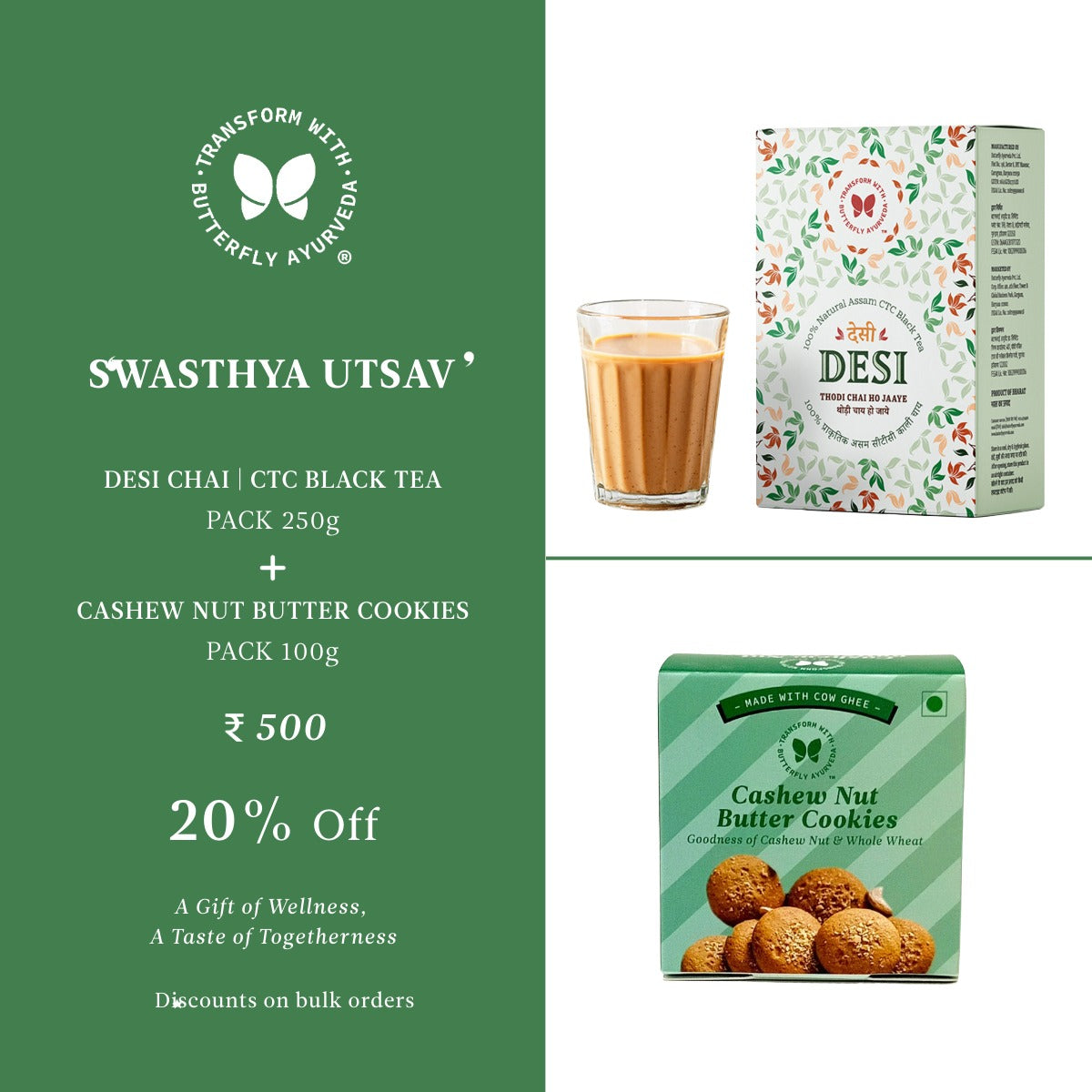 Swasthya Utsav is more than a combo — it’s a celebration in a box. A blend of rich, comforting Desi Chai and our wholesome Cashew Nut Butter Cookies, this duo is designed to be shared, gifted, and savoured with love.